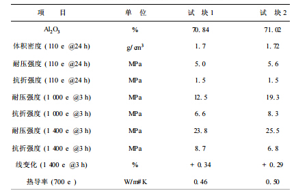 同一品種的原料體積密度較大的輕骨料,其澆注料有較高的耐壓強(qiáng)度和抗折強(qiáng)度。不同廠家的生產(chǎn)工藝不同,輕骨料本身的強(qiáng)度也有較大的差別,選擇何種原料應(yīng)該通過(guò)檢驗(yàn)澆注料試塊來(lái)決定。輕質(zhì)莫來(lái)石澆注料的主要技術(shù)指標(biāo)見表2。