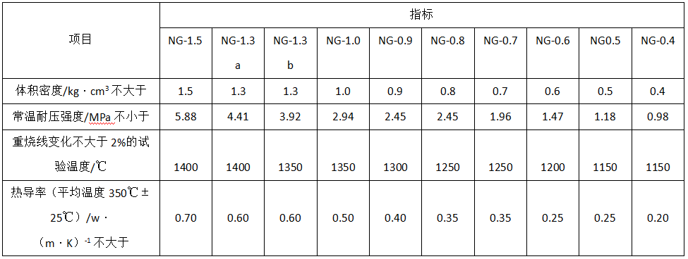 中國標(biāo)準(zhǔn)將粘土質(zhì)隔熱磚按體積密度分為NG-1.5,NG-1.3a、NG-1.3b、NG-1.0、NG-0.9、NG-O.8,NG-O. 7、NG-O.6、NG-0.5、NG-O.4 10 種牌號(hào),其物理指標(biāo)和尺寸允許偏差見表1-1和表1-2。