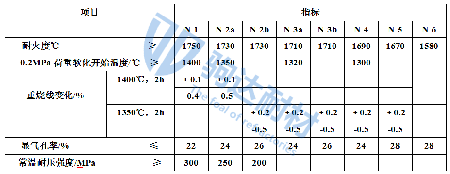 中國冶標(YB/T 5106 — 1993)將粘土質(zhì)耐火磚按理化指標分為N-1、N-2a、N-2b、N-3a、N-3b、N-4、N-5、N-6八種牌號,其理化指標見表1所列。