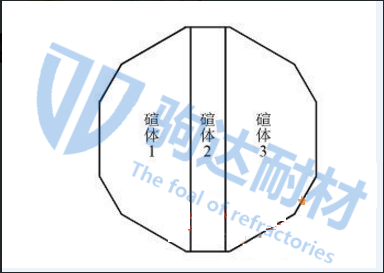 隨著近年來電熔窯逐漸向大熔化面積(熔化面積大于20m2)發(fā)展方向,對(duì)于吊碹的設(shè)計(jì)也提出了新的挑戰(zhàn)。吊碹面積加大意味著重量增加,為了保證吊碹的可重復(fù)利用因此獨(dú)創(chuàng)了分體吊碹結(jié)構(gòu),圖1為國內(nèi)某廠家設(shè)計(jì)的21m2電熔窯吊碹拆分示意圖,將碹體分為3部分,每部分獨(dú)立承重在裝卸時(shí)可單獨(dú)拆分吊裝。