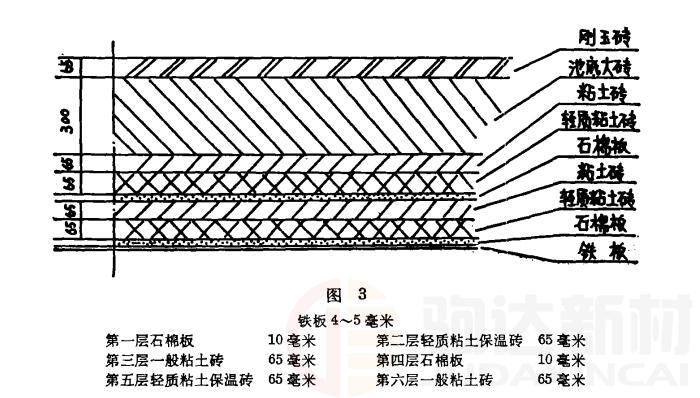 池底保溫材料一般為:輕質(zhì)粘土保溫磚、耐火粘土轉(zhuǎn)、石棉板等耐火保溫材料。