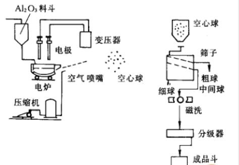 氧化鋁空心球的制備方法有滾球燒失法和熔融噴吹法。滾球法是先用有機樹脂或低熔物做成芯丸,放在旋轉的圓盤里,再把含有一定水分的潮濕的氧化鋁細粉撒在盤中,粘附在芯丸上,形成一個外殼,宛如在藥丸外包裹一層糖衣一樣。然后把這種球丸放在高溫下燒成,其中的芯丸燒失揮發(fā)掉,而外殼達到燒結,形成空心球。這種方法的缺點是效率低,球面不光滑,且壁厚及大小不易控制,因此工業(yè)生產(chǎn)中采用得不多。