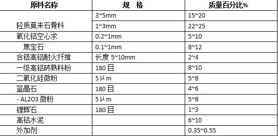 通過選用具有多孔結(jié)構(gòu)的輕質(zhì)莫來石骨料、氧化鋁空心球和導(dǎo)熱系數(shù)較小的含鋯高鋁耐火纖維, 達(dá)到提高爐輥保溫性能, 減少冷卻水帶走的熱損失, 同時(shí)降低體積密度, 減少爐輥的重量與轉(zhuǎn)動(dòng)的動(dòng)力消耗的目的;通過0.1~1 mm的焦寶石的加入, 彌補(bǔ)了小于1 mm輕質(zhì)骨料性能劣化的不足, 并通過焦寶石優(yōu)良的熱震穩(wěn)定性與高溫性能, 提高了澆注料的綜合使用性能;通過使用水泥、二氧化硅和-Al2O3微粉作為復(fù)合結(jié)合劑, 引入水合結(jié)合和凝聚結(jié)合兩種凝結(jié)硬化機(jī)理, 提高材料的低、中和高溫強(qiáng)度;通過加入少量鋰輝石粉的燒結(jié)促進(jìn)作用, 改善澆注料使用條件下的燒結(jié)狀況, 促進(jìn)爐輥澆注料隔熱襯使用條件下高溫陶瓷結(jié)合相的形成, 提高隔熱襯的抗破損能力;通過添加含鋯高鋁耐火纖維, 利用其在基體中的拉拔作用所產(chǎn)生的增強(qiáng)、增韌效應(yīng), 提高爐輥澆注料抗機(jī)械振動(dòng)能力和抗沖擊韌性;通過添加藍(lán)晶石粉作為膨脹劑, 利用藍(lán)晶石高溫下不可逆分解為莫來石和游離的Si O2而產(chǎn)生體積膨脹, 抵消澆注料高溫下體積收縮, 防止?jié)沧⒘吓c金屬輥身之間熱膨脹不匹配造成的澆注料層開裂和脫落;通過減水劑、有機(jī)消泡劑和硅烷偶聯(lián)劑等外加劑的使用, 提高了澆注料的施工流動(dòng)性, 降低了澆注料的加水量, 改善了爐輥澆注隔熱襯施工質(zhì)量與綜合性能。