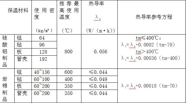 設(shè)備和管道的保溫伸縮縫和膨脹間味的填塞材料采用硅酸鋁氈(介質(zhì)溫度>350℃)和巖棉氈(介質(zhì)溫度≤350℃),典型的保溫材料技術(shù)性能參數(shù)如下表所示。